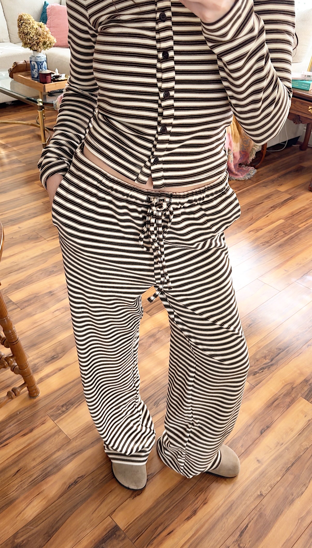 Our 'Julie' striped knit pants feature a mid rise drawstring waist, baggy leg fit, and a soft knit material. Model is wearing a size small.